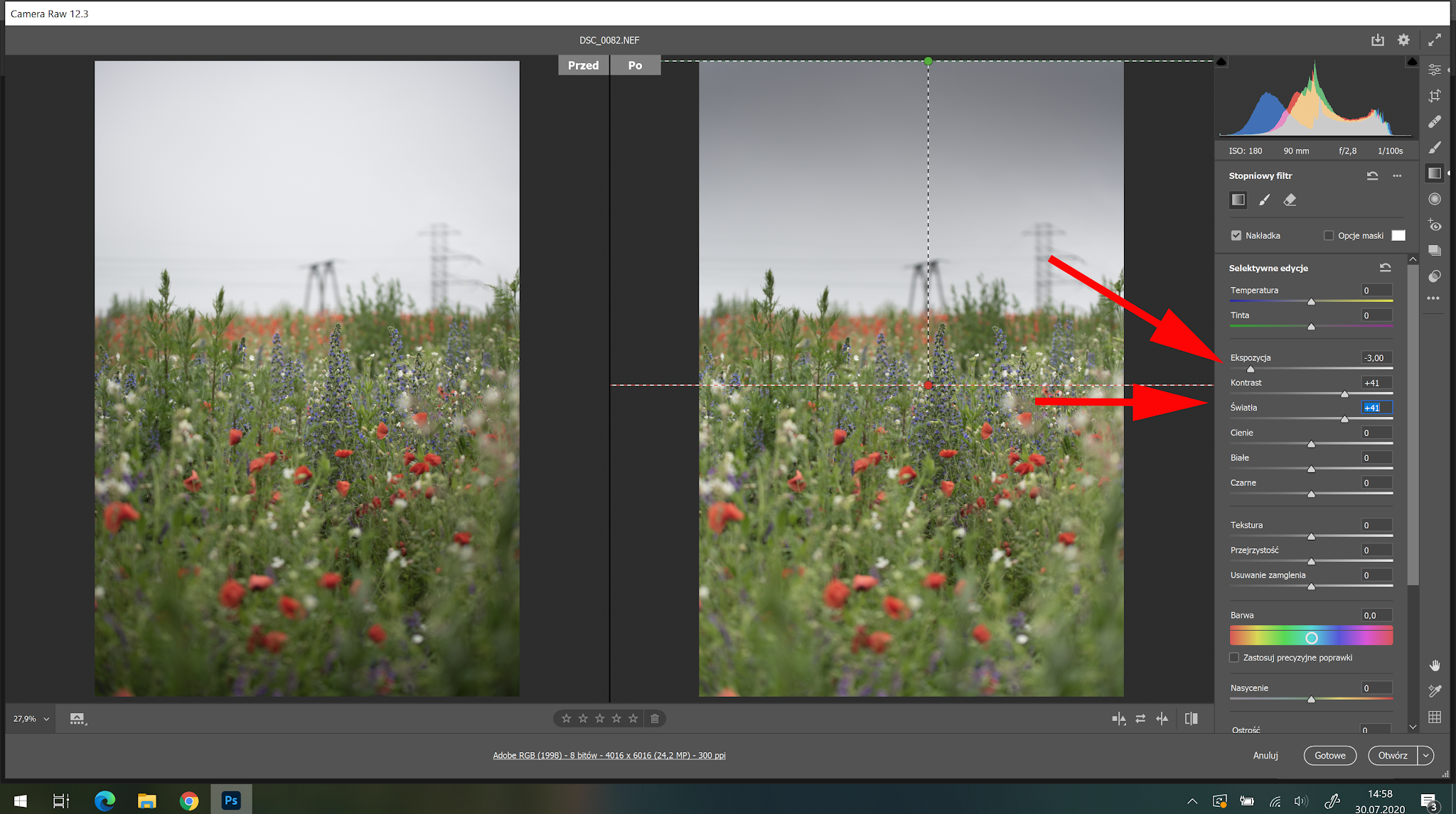 Za pomocą paska narzędzi po prawej stronie (piąta ikonka od góry) włącz narzędzie Graduated Filter (Stopniowy filtr). Jego obsługa polega na kliknięciu i przeciągnięciu kursorem myszy w wybranym kierunku.