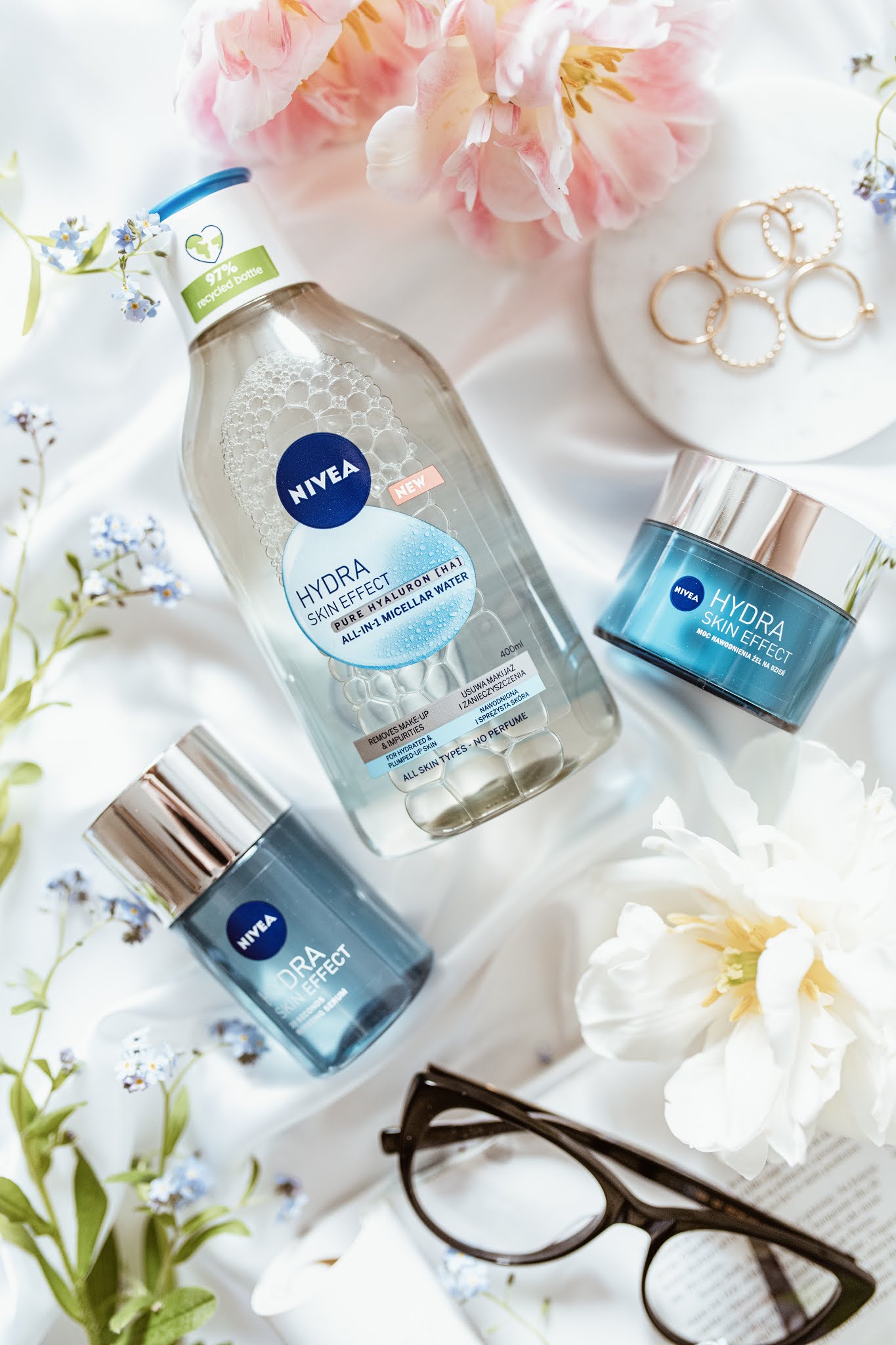 Codzienne nawilżanie skóry to podstawa zachowania jędrności, zdrowego wyglądu oraz młodości. Jednym z podstawowych składników, który odpowiada za wysoki poziom nawilżenia jest kwas hialuronowy. Znajdziemy go w nowej linii Nivea Hydra Skin Effect. Siła 3 produktów ma przynieść skórze komfort oraz intesywne nawilżenie od wewnątrz do 72h! Płyn micelarny usuwa makijaż i zanieczyszczenia, żel na dzień przyjemnie odświeża skórę, a esencja-serum wtapia się w skóre w 20 sekund i zwiększa jej poziom sprężystości. Jeśli jesteście ciekawi jak sprawdziła się u mnie najnowsza seria Nivea to zapraszam Was do dalszej lektury.